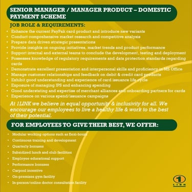 1Link Pvt Ltd Jobs Senior Manager / Manager Product Domestic Payment Scheme