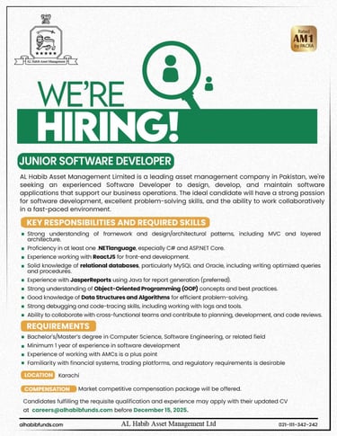 AL Habib Asset Management Limited is looking for a talented and self-driven individual for the position Junior Software Developer.
