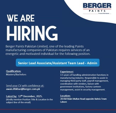 Berger Paints Pakistan Jobs Senior Lead Associate / Assistant Team Lead