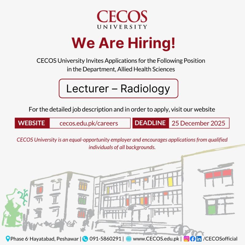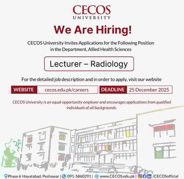 CECOS University is inviting applications for the position of Lecturer – Radiology in the Department of Allied Health Sciences.