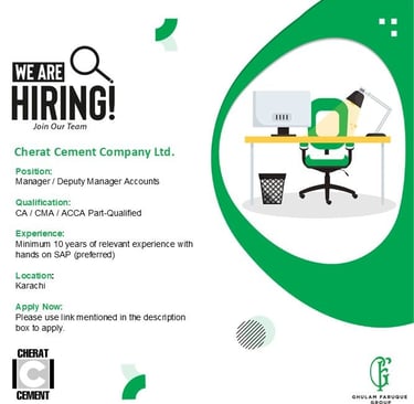 Cherat Cement Company Limited (part of Ghulam Faruque Group) is looking for a Manager/DM – Accounts for its Head Office, Karachi.