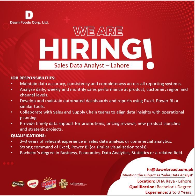 hr@dawnbread.com.pk Mention the subject as ‘Sales Data Analyst’