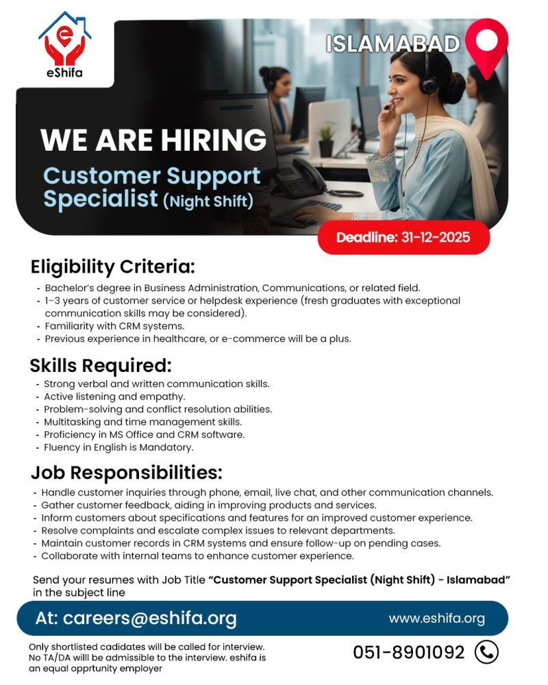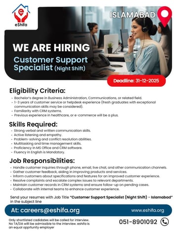 eShifa is looking for a Customer Support Specialist (Night Shift) to join our growing team. If you have strong communication skills and a customer-focused mindset, we’d love to hear from you.