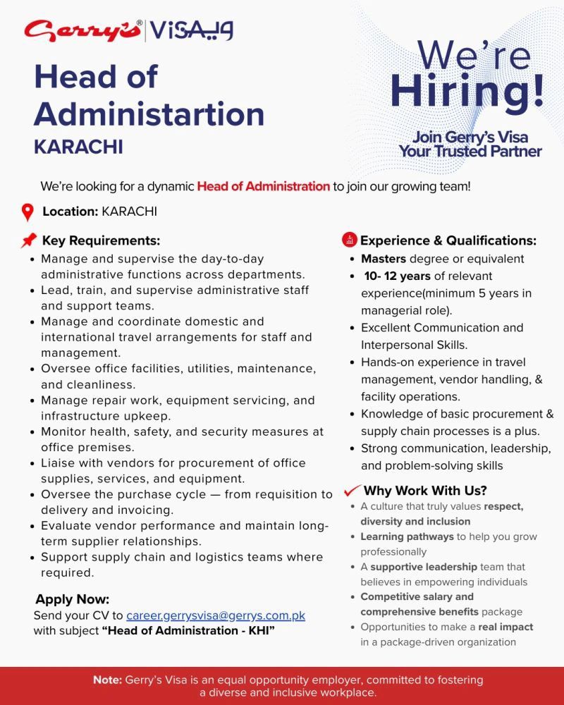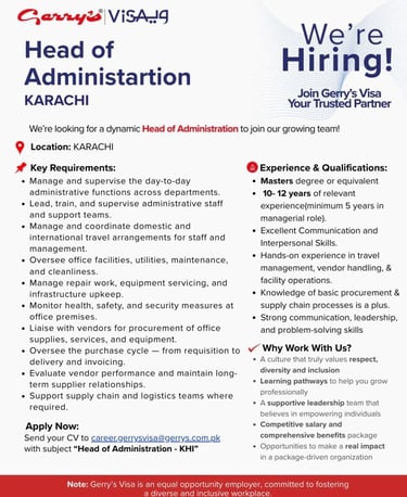 Gerry’s Visa is seeking a highly capable Head of Administration to lead, supervise, and streamline their administrative operations across multiple departments.