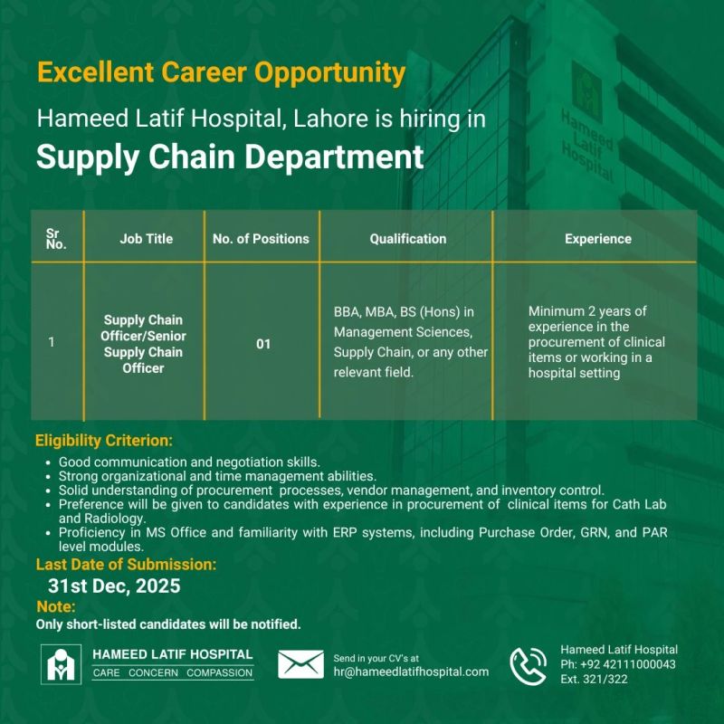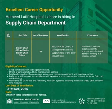 Hameed Latif Hospital Jobs Supply Chain Officer / Sr Supply Chain Officer: