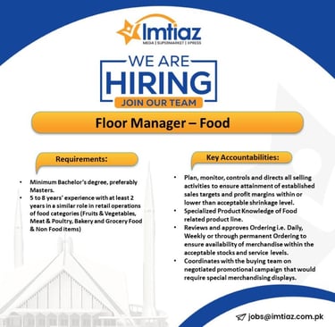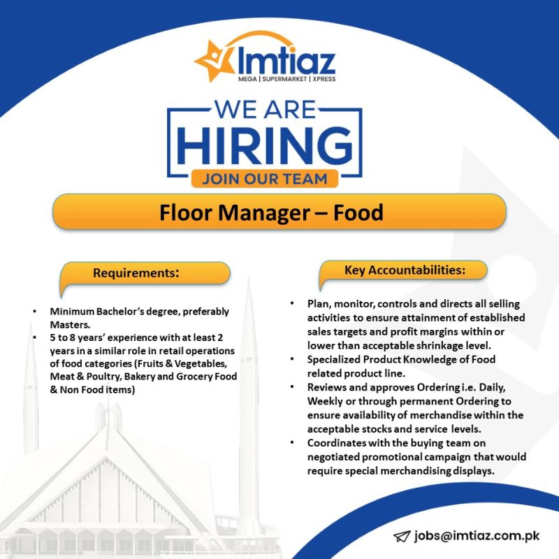 Interested eligible candidates can share updated resume at jobs@imtiaz.com.pk. Please mention position title in email subject line.