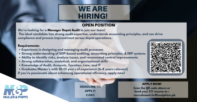 Muller & Phipps Pakistan (Pvt.) Ltd. is looking to onboard a Manager Depot Audit for its Head Office in Karachi.