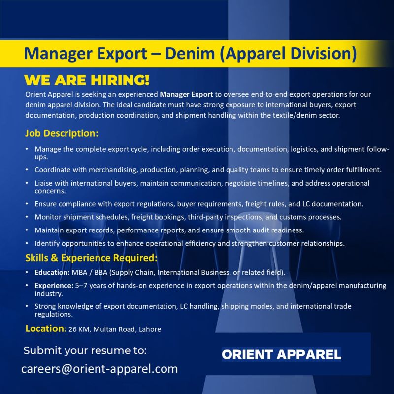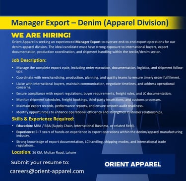 Orient Apparels is looking for an experienced Manager Exports to oversee export operations, manage client relationships, ensure shipment compliance, and drive business growth.