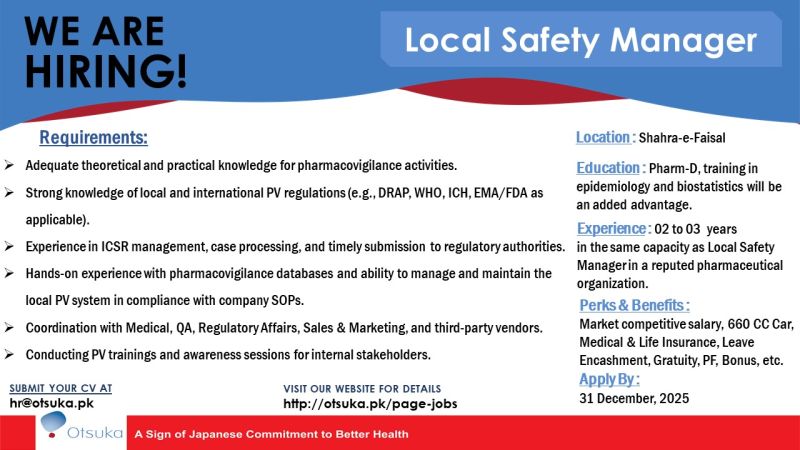 · Experience: 02 to 03 years in the same capacity as Local Safety Manager in a reputed pharmaceutical organization.