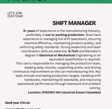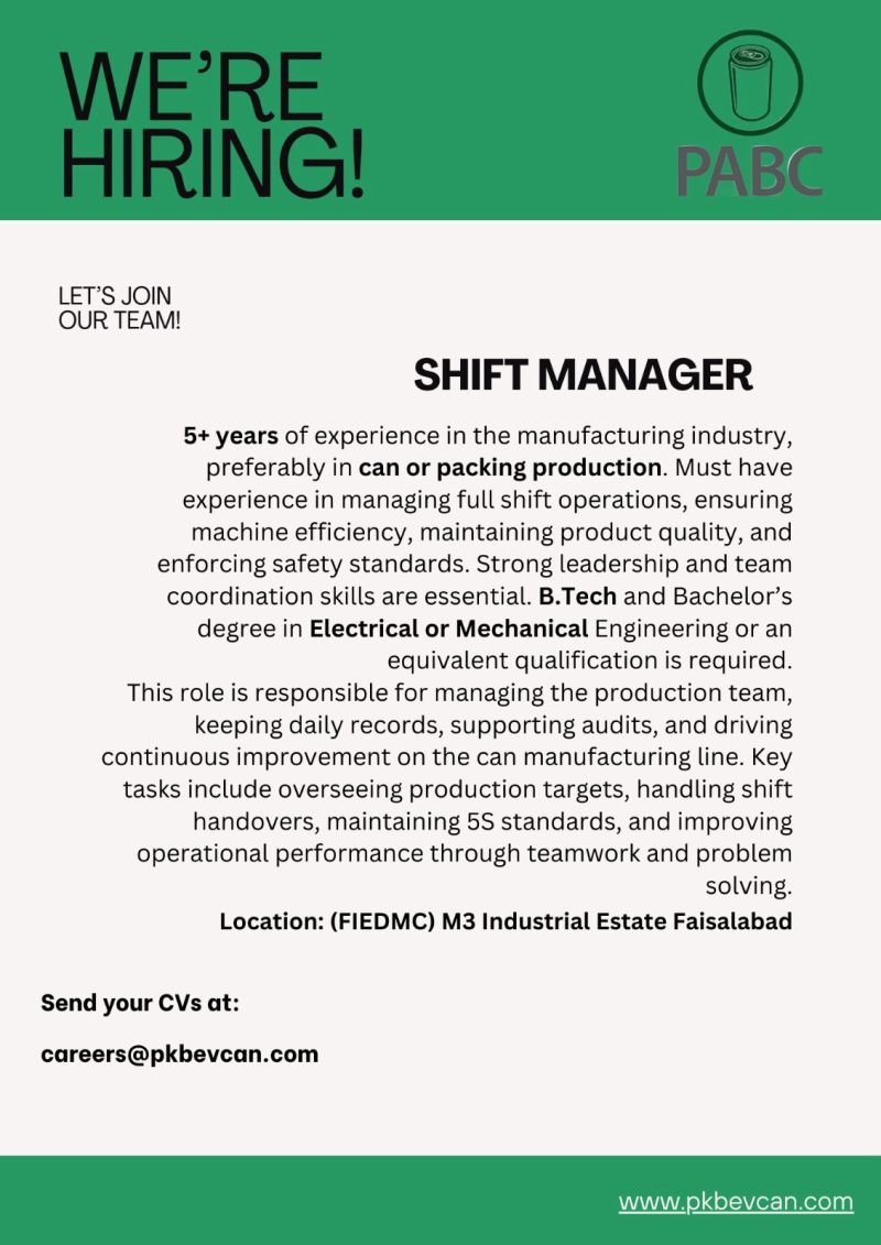 Pakistan Aluminium Beverage Cans Limited PABC Jobs Shift Manager Production: