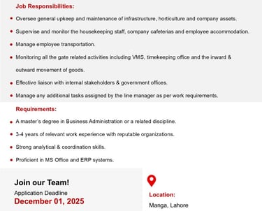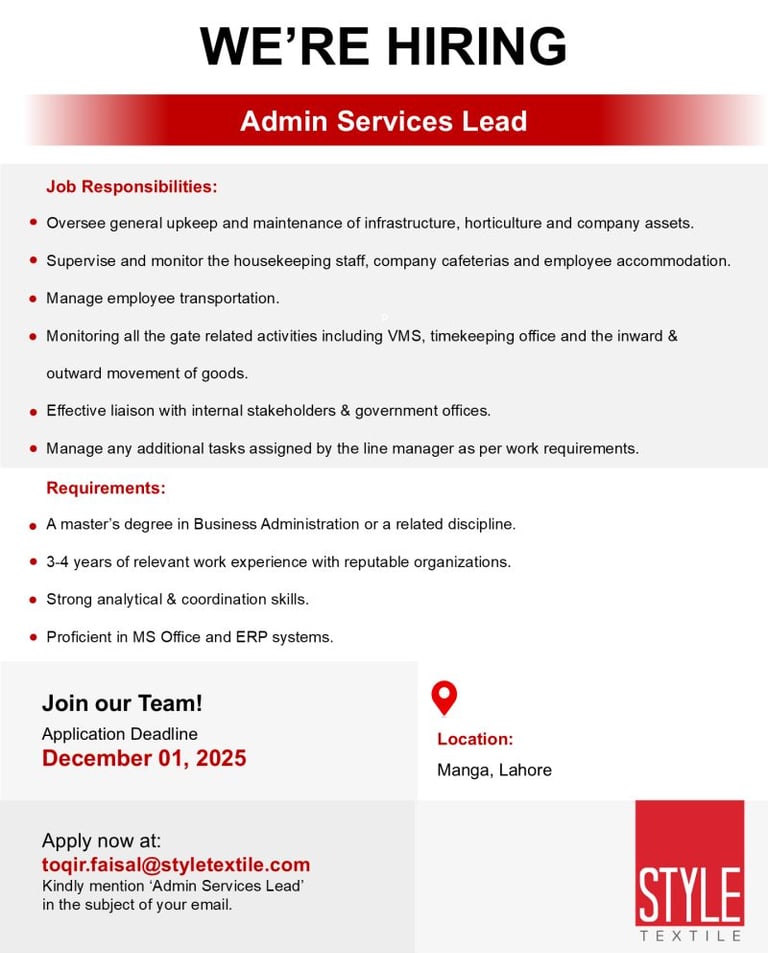 Apply now at: toqir.faisal@styletextile.com Kindly mention ‘Admin Services Lead’ in the subject of your email.