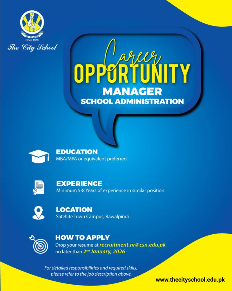 The City School is looking to fill the position of Manager School Administration at the Satellite Town Campus, Rawalpindi