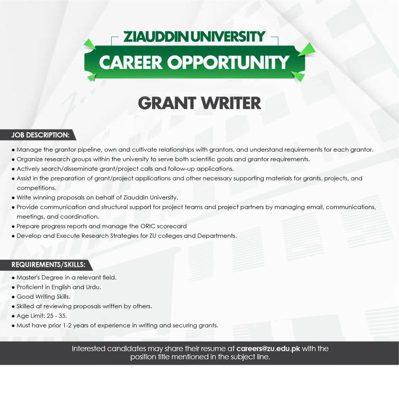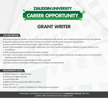 Ziauddin University Jobs Grant Writer :